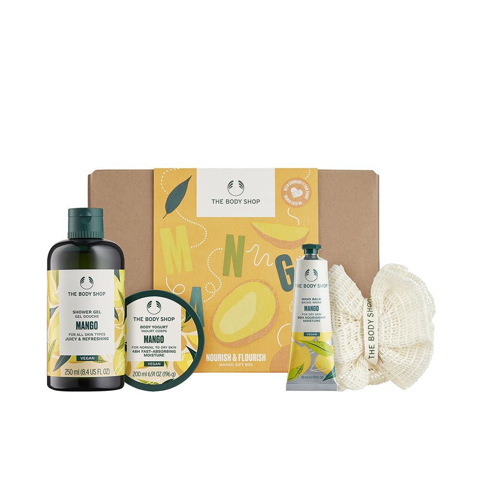 Gel de banho 250 ml + iogurte corporal 200 ml + creme para as mãos 30 ml + flor de lavagem